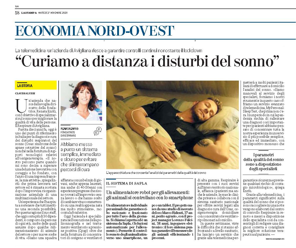 Un’esperienza che l’ha spinta a sostenere che tutti meritino una seconda possibilità. Per questa ragione il suo staff, che oggi conta più di 30 dipendenti, è composto da persone di ogni età, molte delle quali assunte dopo qualche ridimensionamento di aziende del settore o per nuove scelte di vita. «Siamo una squadra affiatata con un bel mix di giovani, anche appena laureati, ma anche di 40-50enni con esperienze pregresse che si sono trovati all’improvviso senza lavoro o che hanno scelto di cambiare vita scommettendo su una realtà appena nata ma molto stimolante», racconta la fondatrice. Oggi l’azienda è specializzata nell’esecuzione della polisonnografia e nel trattamento ventilatorio a pressione positiva (Cpap) oltre che nella fornitura di concentratori di ossigeno e ventilatori di alta gamma. Respiraire è presente con i suoi servizi sull’intero territorio nazionale, affianca i pazienti ma anche le aziende, le rsa e le cliniche private e collabora con il sistema sanitario nazionale per offrire servizi legati alla diagnosi e cura dell’Osas, ossigenoterapia domiciliare con concentratori e ventilatori polmonari a domicilio. In queste settimane, viste le difficoltà che si stanno affrontando a livello sanitario, ha lanciato un servizio che grazie alla telemedicina permetterà permetterà a molti pazienti italiani di effettuare a domicilio l’analisi del sonno.