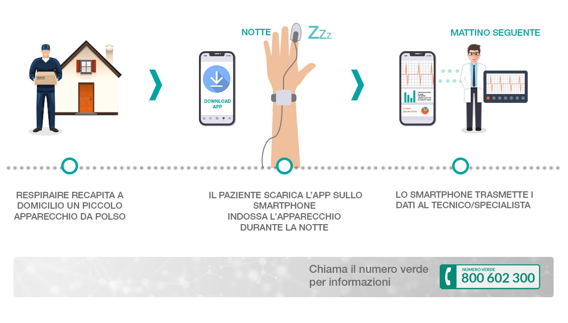 Su richiesta del paziente, Respiraire recapita a domicilio un piccolo apparecchio da polso. Il paziente, in totale autonomia, scarica l’app sul proprio smartphone, e, nella notte che preferisce, indossa l’apparecchio e attiva il test. La mattina dopo, lo smartphone trasmetterà i dati per la successiva analisi di uno specialista suo o su consiglio di Respiraire, che rimane a disposizione per le fasi successive di terapia, se necessaria.